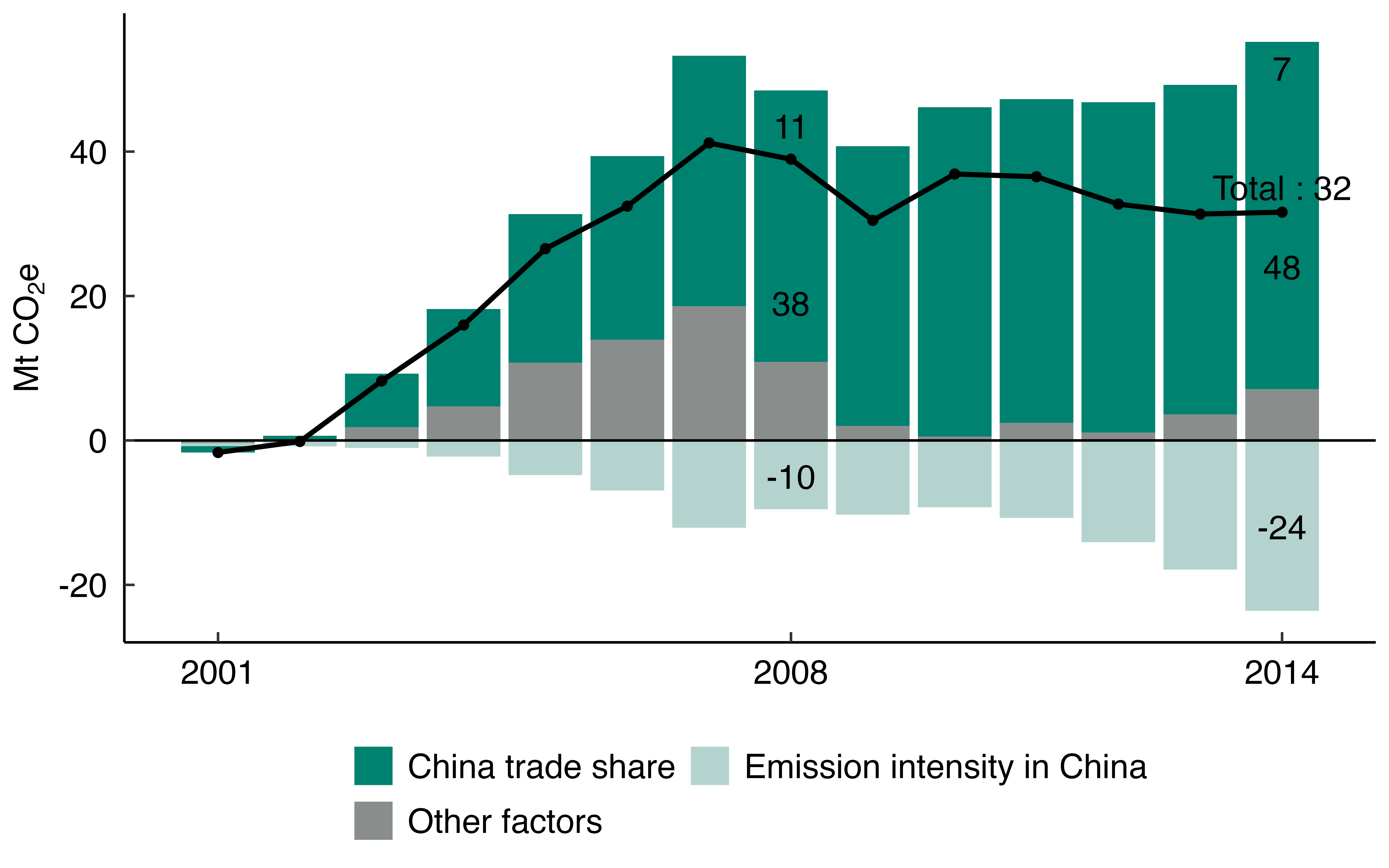For a country like France, which has already significantly decarbonized its electricity production and relies heavily on imports, much of the progress in reducing its carbon footprint has occurred beyond its borders. In fact, technological improvements abroad contributed more to reducing France’s consumption-based emissions than those made domestically. Overall, between 2000 and 2014, the decrease in emission intensity reduced France’s carbon footprint by 182 Mt CO₂e (Table 2). Of this reduction, 76 Mt came from changes in emission intensity within France, while the remaining 106 Mt resulted from technological gains abroad. European partners played a key role: their technological progress reduced France’s footprint by 40 Mt, while China also contributed significantly, accounting for a 24 Mt decrease.
