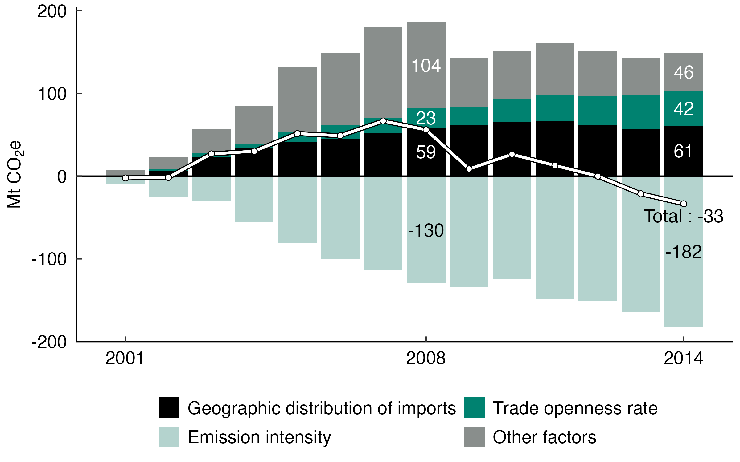Notes: Between 2000 and 2014, the change in emission intensity in France helped reduce the French carbon footprint by 76 Mt CO₂e.